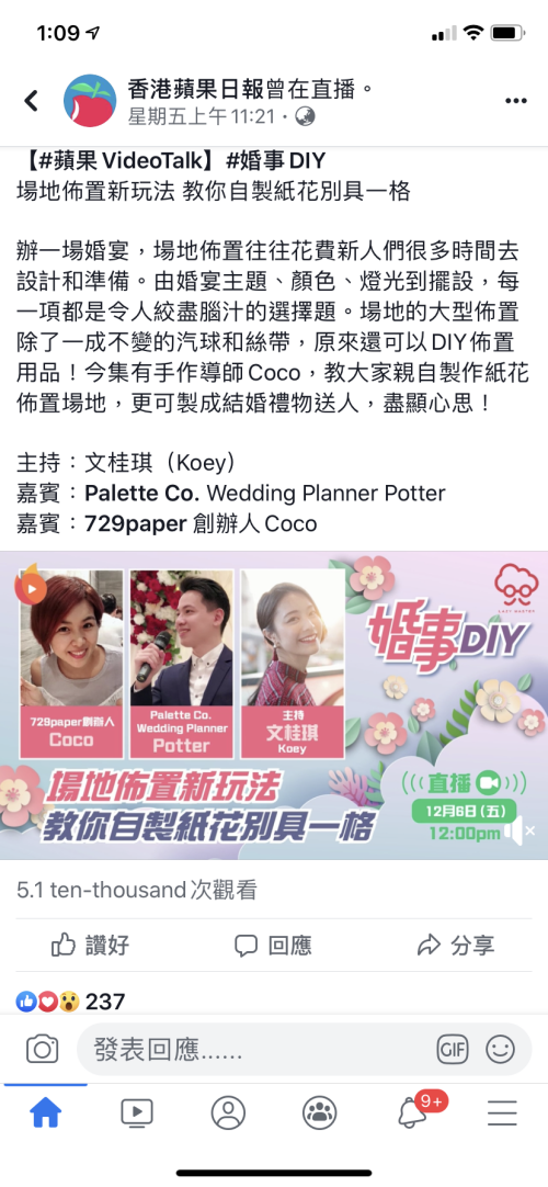 辦一場婚宴,場地佈置往往花費新人們很多時間去設計和準備。由婚宴主題、顏色、燈光到擺設,每一項都是令人絞盡腦汁的選擇題。場地的大型佈置除了一成不變的汽球和絲帶,原來還可以DIY佈置用品!今集有手作導師Coco,教大家親自製作紙花佈置場地,更可製成結婚禮物送人,盡顯心思!