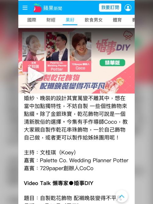 【蘋果日報Video Talk】- 自製作乾花串珠飾物試範婚紗、晚裝的設計其實萬變不離其中,想在當中加點獨特性,不妨自製 一些個性飾物來點綴。除了金銀珠寶,乾花飾物可說是一個清新脫俗的選擇。今集有手作導師Coco,教大家親自製作乾花串珠飾物,一於自己飾物自己做,或者更可以製作給姊妹團用呢!